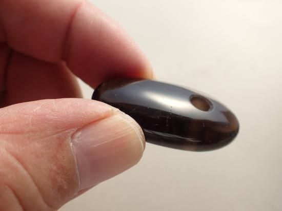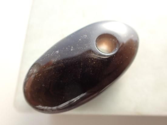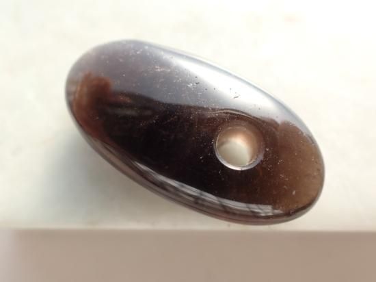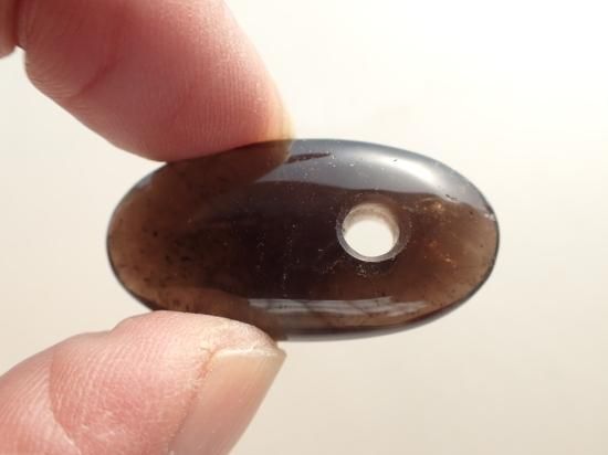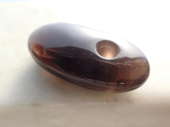 サイズ:約35x18x10mm。山東省産の茶水晶(スモーキークォーツ)を使用しています。この産地のスモーキークォーツは邪気の吸着作用にすぐれていて、ヒーリング効果が高いことで知られています。この産地の原石を独自に入手、香港の天然石製品製作工場で、大珠に加工してもらいました。山東省産のスモーキークォーツはたくさんのクラック(ひび割れ)やクラウド(曇り)、いわゆる石目(カン)が入っています。一部は製品の表面にでて傷になっていますが、不良品ではありません。実物は写真ほど石目が目立たず、活用する分には気にならないと思います。最後の写真は紐ペンダントにした場合の見本です。