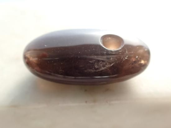 サイズ:約35x18x10mm。山東省産の茶水晶(スモーキークォーツ)を使用しています。この産地のスモーキークォーツは邪気の吸着作用にすぐれていて、ヒーリング効果が高いことで知られています。この産地の原石を独自に入手、香港の天然石製品製作工場で、大珠に加工してもらいました。山東省産のスモーキークォーツはたくさんのクラック(ひび割れ)やクラウド(曇り)、いわゆる石目(カン)が入っています。一部は製品の表面にでて傷になっていますが、不良品ではありません。実物は写真ほど石目が目立たず、活用する分には気にならないと思います。最後の写真は紐ペンダントにした場合の見本です。
