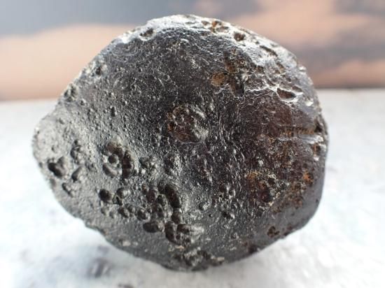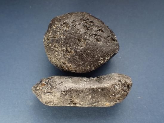 サイズ:円は約59x57x28mm、97g。棒は71mm、50g、雲南省産。テクタイトは巨大隕石の地表への衝突・爆発によって生じます。地表物質が瞬時に溶融・飛散・凝固したもので、インパクト・ガラスともいいます。地表の大部分はケイ酸からなっているのでテクタイトはオブシディアン(黒曜石)と類似の成分です。テクタイトには衝突時に地表にあった灰や泥が溶け込んでいるので、通常は黒色不透明です。モルダバイトやリビア砂漠のリビアングラスは特殊な例です。
