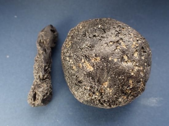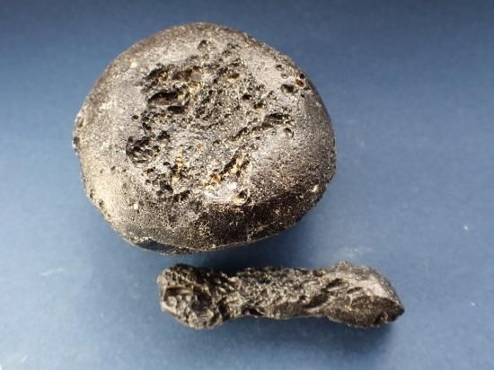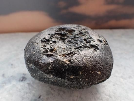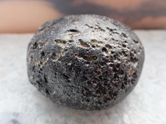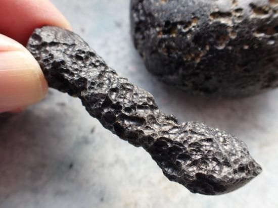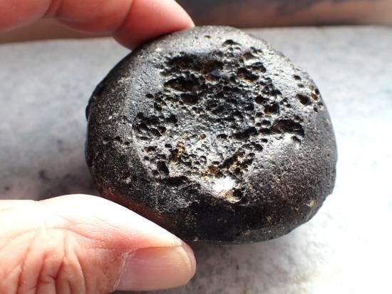 サイズ:円は約60x58x31mm、144g。他は59mm、14g、雲南省産。テクタイトは巨大隕石の地表への衝突・爆発によって生じます。地表物質が瞬時に溶融・飛散・凝固したもので、インパクト・ガラスともいいます。地表の大部分はケイ酸からなっているのでテクタイトはオブシディアン(黒曜石)と類似の成分です。テクタイトには衝突時に地表にあった灰や泥が溶け込んでいるので、通常は黒色不透明です。モルダバイトやリビア砂漠のリビアングラスは特殊な例です。