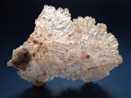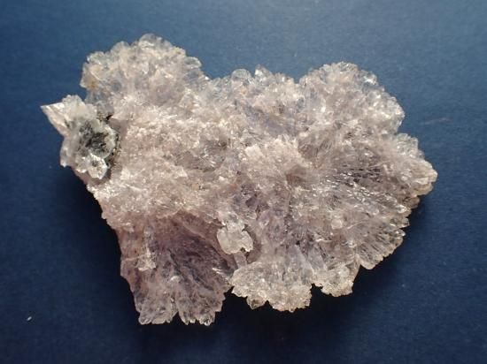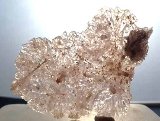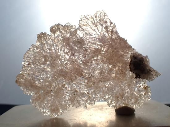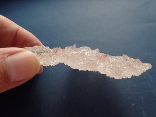 サイズ:約89x55x5mm、29g。せんべいのように薄いフラワーアメシストで淡いピンク色をしています。ブラジル産。フラワーアメシストは水晶の変わり種のひとつで、通常のペンシルスタイルの水晶ポイントとは似ても似つかない形状なので、水晶とは異なる鉱物のようにみえます。岩石の隙間に染み出した熱水から析出するので、板状になりやすいといいます。石灰岩の隙間にできることが多いと聞いています。水晶よりも低い温度で析出します。水晶には想像を絶するほどいろいろな形があって、形状や色に魅了されてしまいます。