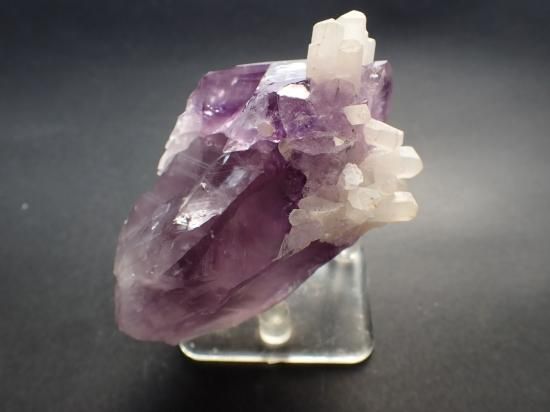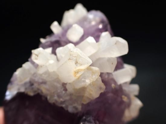 サイズ:約81x50x46mm、180g。ブラジル産。ブラジルやウルグアイ産のアメシスト・クラスターにはしばしばカルサイトが共晶しています。晶洞のなかでアメシストが析出してから時間が経って、炭酸カルシウム濃度の濃い地下水が晶洞を浸すとカルサイトがアメシストの上に乗る形で結晶していきます。地殻のなか出過ぎてゆく地質学的時間に触れられます。同好の志に自慢できるコレクターズアイテムです。