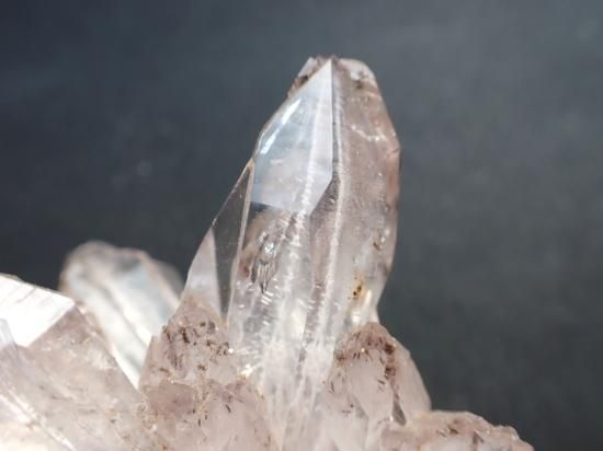 サイズ:約79x38x57mm、126g。ブラジル産。いくらか色がついているのでアメシストに分類してありますが、どのポイントも縦に半分に割った水晶を接合したかのような不思議な形をしています。こうした理解しがたい結晶の形ははじめてみました。同好の志に自慢できるコレクターズアイテムです。(学術的には知られている結晶と思います)。