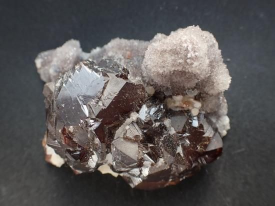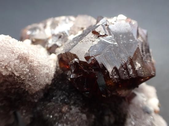 サイズ:約67x50x23mm、98g。中国産。結晶形が美しく得がたい形状のスファレライトです。ジンクブレンドともいいます。スファレライトには紛らわしいという意味があり、多くのスファレライトは亜鉛とともに産出して、亜鉛に似て紛らわしいために名付けられました。和名は閃亜鉛鉱。ルースをカットした場合、ファイア効果はダイアモンドの4倍あるといいます。透過光で見ると鮮やかな鼈甲(べっこう)色の群晶を確認できます。ドウルージークォーツと共晶しています。霊的覚せいをうながすパワーストーンとされていて、石に見入ることで過去世を思い出すことがあるといいます。(ペンライトで照明すると鮮やかなオレンジ色を確認できます)