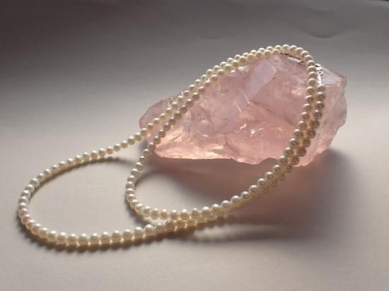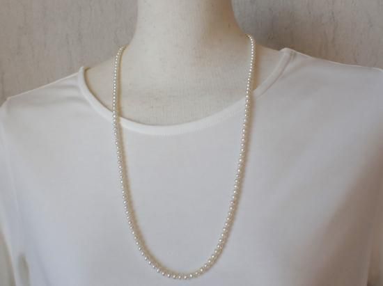 淡水パールのロングネックレス・シリーズで、約4mmの高品質白色系淡水パールを使用しています。淡水パールは形状からライスパール、ポテトパールなどに分けられ、真円に近いものほど高価とされています。この淡水パールはポテトパールのうちでも球状に近く、粒揃いのものを選んで組まれています。品がよくて日本人の肌をいっそう美しく見せてくれます。お送りするのはネックレスのみです。写真に写っている翡翠原石などは製品に付属していません。