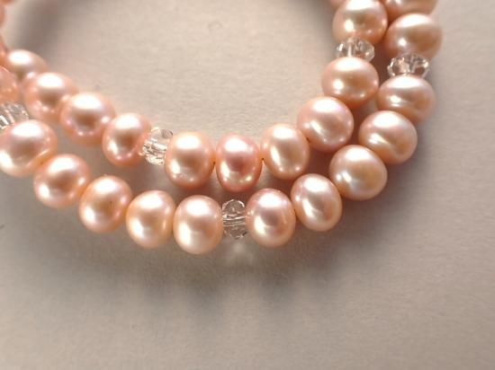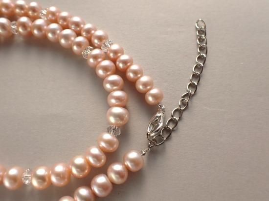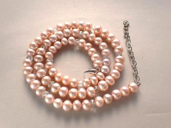 サイズ:ポテトパール約7.5x6mm、全長約50cm、5粒おきに水晶ファセット・ビーズが入っています。銀色カニツメ・クラスプ使用、ステンレスワイヤー結び。5cmアジャスター。 在庫数5点。棚ざらえなので5割引にしてあります。業者区分ではピンク系になっていますが、白色に近く真珠光沢の美しい色艶の製品です。言葉での表現が難しい色合いです。ゴージャスで気品のある色艶です。