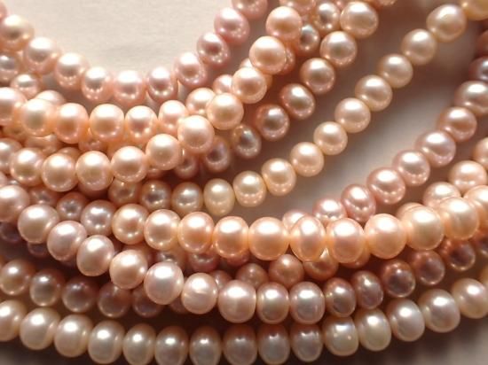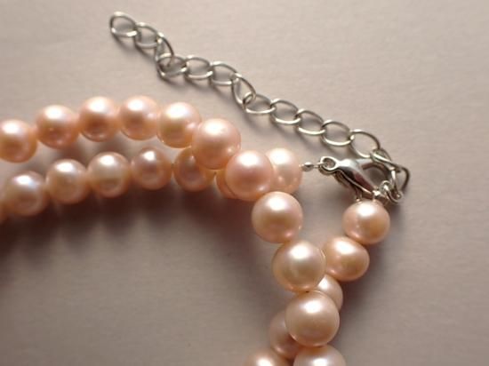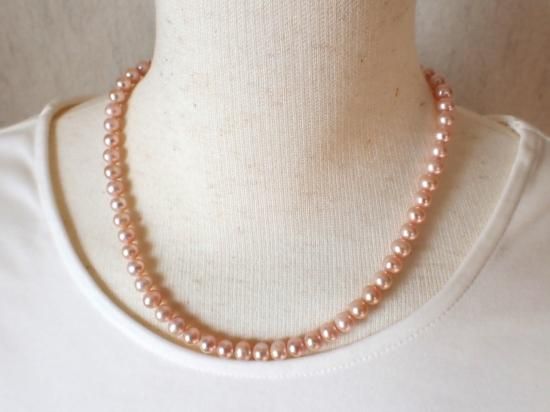 サイズ:ポテトパール約7.5x6mm、全長約40cm、銀色カニツメ・クラスプ使用、ステンレスワイヤー結び。5cmアジャスター。在庫数5点。棚ざらえなので5割引にしてあります。業者区分ではピンク系になっていますが、白色に近く真珠光沢の美しい色艶の製品です。ゴージャスで気品があります。