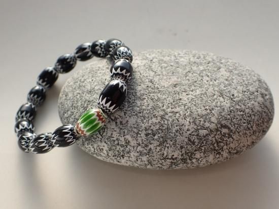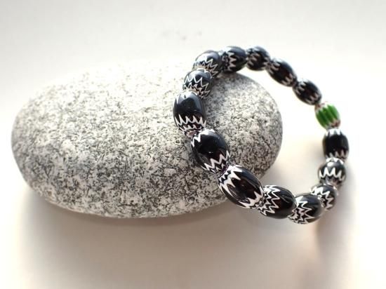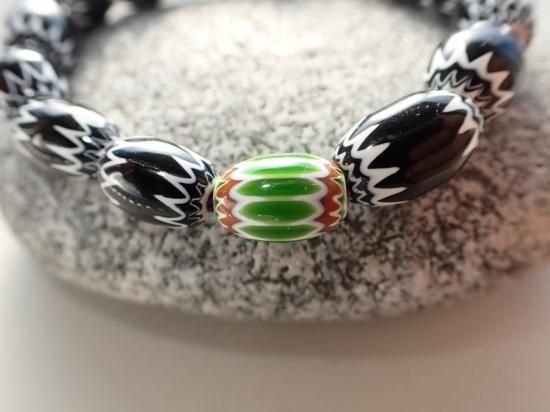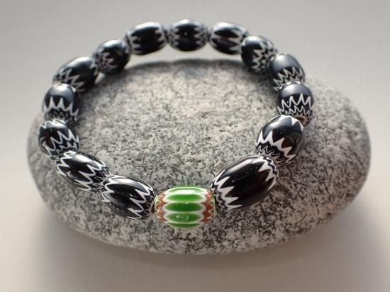 サイズ:長さ12―8mm前後。青色よりやや大きめです。緑色を1個加えてあります。緑はストックが少ないので珍しいかもしれません。ブレスレットの内径16cm。オペロンゴム結び。シェブロン(ロゼッタ)ビーズは断面にノコギリの刃のようなギザギザ模様があるエレガントなトレードビーズ(交易用ガラスビーズ)で、15世紀にイタリアのベネチュアで作られるようになり、「ビーズの貴族」とよばれてきました。