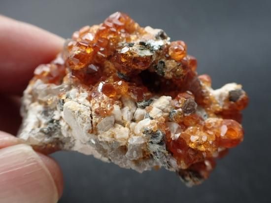 サイズ:約44x26x25mm、32g。中国福建省産スペサルタイト・ガーネットです。この産地のものはオレンジの色味が強く、この標本のようにしばしばスモーキークォーツを随伴しています。ガーネットは24面体や12面体の結晶形をしていて、色味も赤や橙色をした愛らしい鉱物。結晶形を同じくした14種類の鉱物のグループ名で、スペサルタイトはマンガン+アルミニウム+ケイ酸塩からなっています。和名は満礬柘榴石。「満」はマンガン、「礬」はアルミニウムを指していて、成分がそのまま鉱物名になっています。