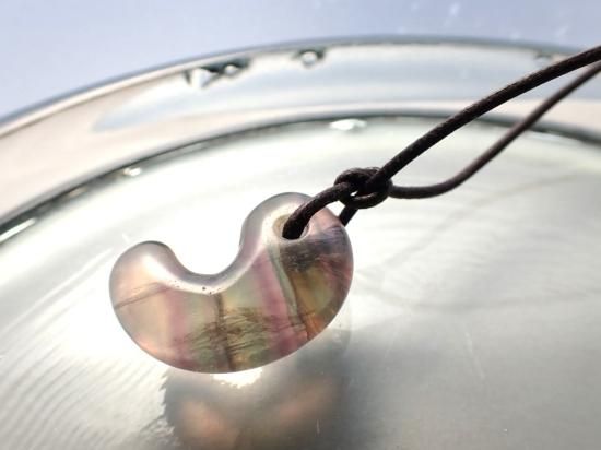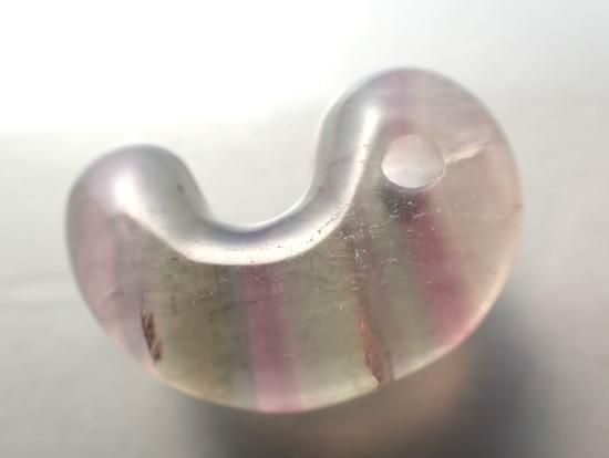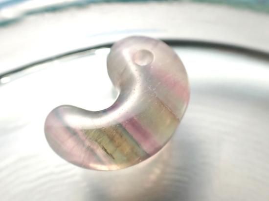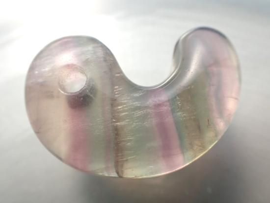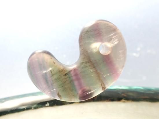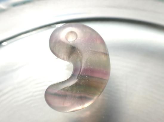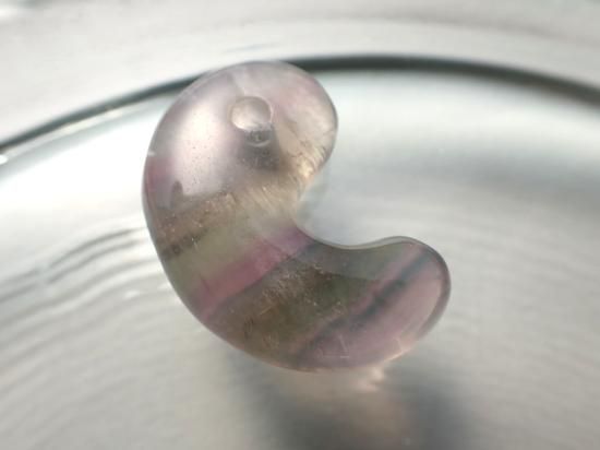 吉祥勾玉は30ミリ・サイズの特製勾玉。幸運を招く呼び水となるよう願っての愛称です。このシリーズのフローライトは模様がひとつずつ異なるので一点物扱いにしています。写真の製品をお送りします。最後の写真は紐をつけた場合のサンプルです。紐は製品い付属していません。お送りするのは勾玉本体のみです。