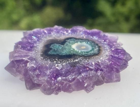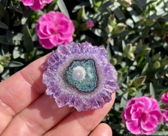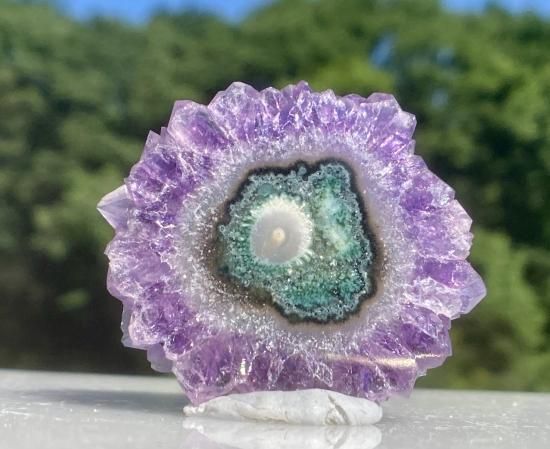 鍾乳石状(柱状)に成長したアメシストを輪切りにしています。