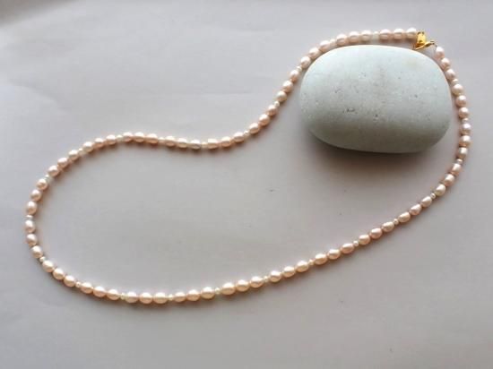 サイズ:ライスパール約6x5mm&3mm。全長約60cm。金色クラスプを使用。ライスシェイプ・パールの間に3mm玉パールを入れてあります。淡いピンクまじりの銀色をしていて、気品の高い色合いです。パールは女性の肌を輝かせてくれます。ピンクやオレンジ系のパールはよりいっそう女性の魅力を引き出してくれます。天然石とパールの組合わせは異国のバザールに遊ぶようなたのしさがあります。
