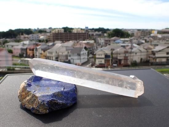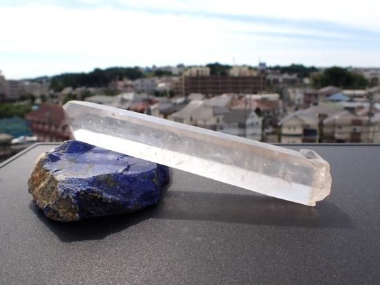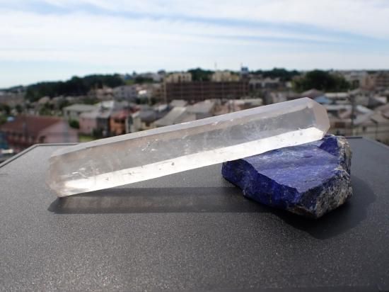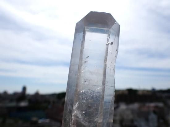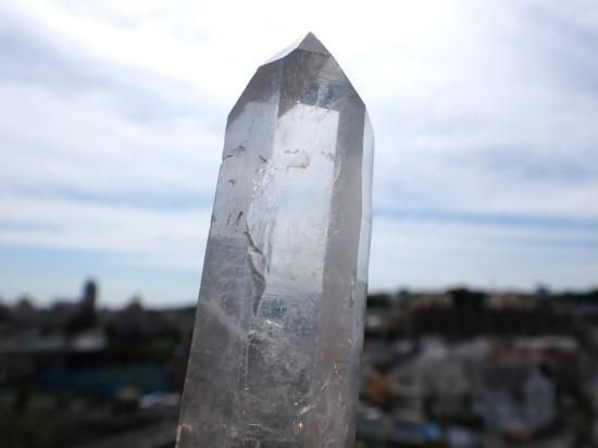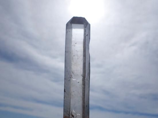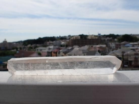 サイズ:約177x28x25mm、239g。 根本のほうから先端までほぼ同じ太さで結晶が発達したブラジル産水晶ポイントです。通常の水晶より高圧のもとでゆっくりと成長すると水晶は細長く結晶するそうです。水晶はケイ酸分子が電子の手をつなぎながららせん状に結晶が成長します。水晶ポイントをヒーリングに用いる際、ヒーラーのパワーは,こうした構造にしたがって、水晶内部を伝わり増幅されると想像されています。その結果レーザー光線のようにパワーが収束されるので、細長い水晶ポイントをレーザークォーツ(クリスタル)とよんでいます。「気」の世界に親しむと、先端にパワーが集うのを見られるようになります。デリケートな製品なのでレターパックプラス、またはユーパックでお送りします。