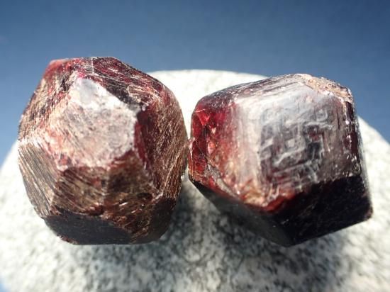 サイズ:直径約20-30mm。中国産アルマンディン・ガーネットの結晶単体2個セットです。和名は鉄礬柘榴石(てつばんざくろ石)。鉄礬は組成の物質を示していて、鉄と礬(アルミニウム)とケイ酸からできています。もっとも古くから重宝されてきたパワーストーンのひとつで、透明濃赤色のアルマンディンをカボーションカットしたものは、「カーバンクル」とよばれていました。ドラゴンの脳から採れた宝石と信仰されて、十字軍の騎士たちにとっては、戦場で傷つかず、無事に帰るお守りだったそうです。