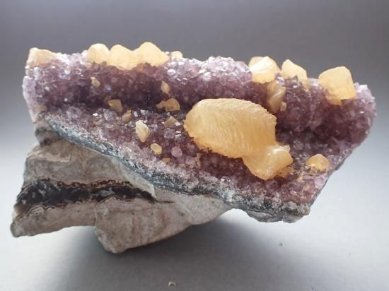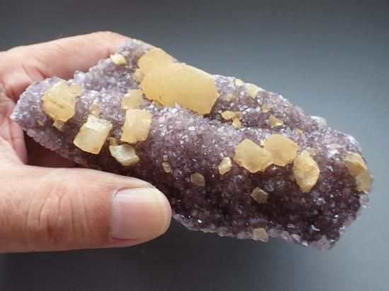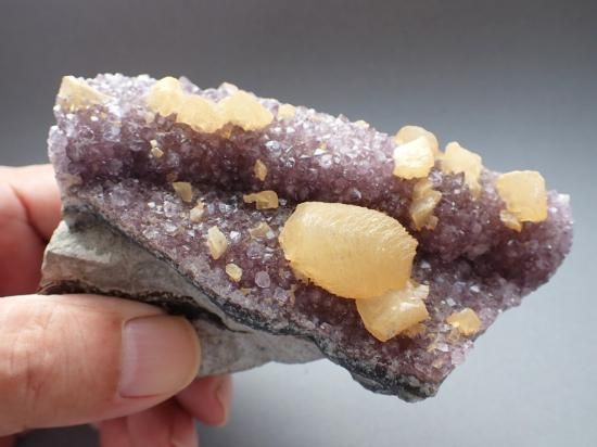 サイズ:約110x65x43mm、332g。この標本では丸い黄色いカルサイトが小粒のアメシストの上に乗っています。アメスシトができた後で、おそらく地層が上昇して、そこに鍾乳石から溶けだした石灰水がやってきたようです。数千万年昔の話です。ブラジル産とのことですが、地続きのウルグアイ産かもしれません。