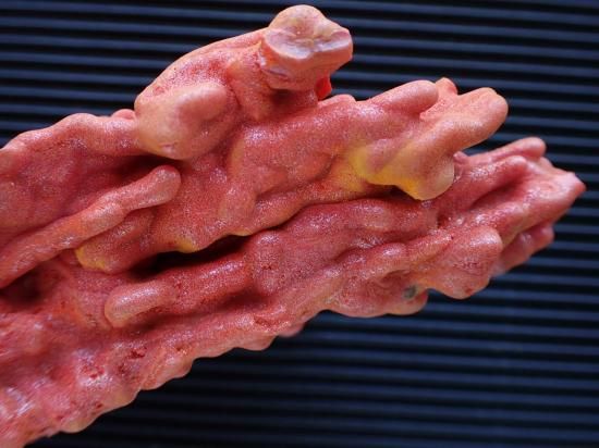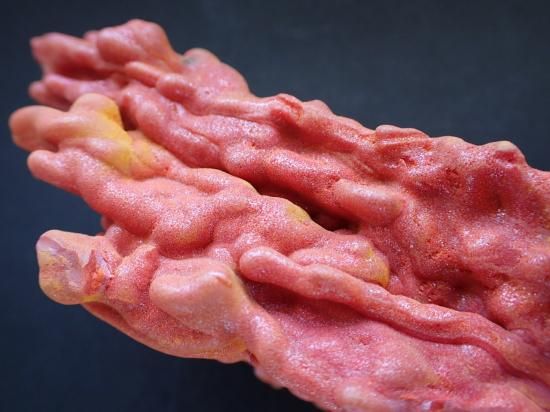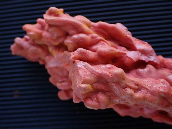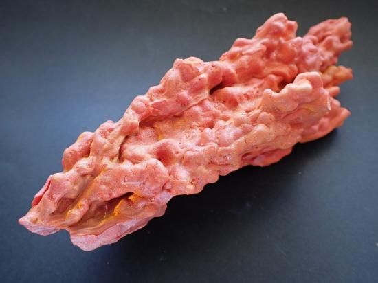 サイズ:約140x50x50mm、276g。中国産。不純物の少ない得がたい標本です。成分はひ素+硫黄。触れるだけで死んでしまうほど猛毒ではないけれど、管理を慎重にして、子供の手の届かない場所に保管してください。光線に弱いのでアルミホイルなどで包んで冷暗所に保存します。顔料鉱物で岩絵の具として使用されています。