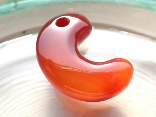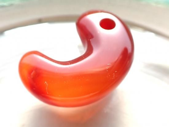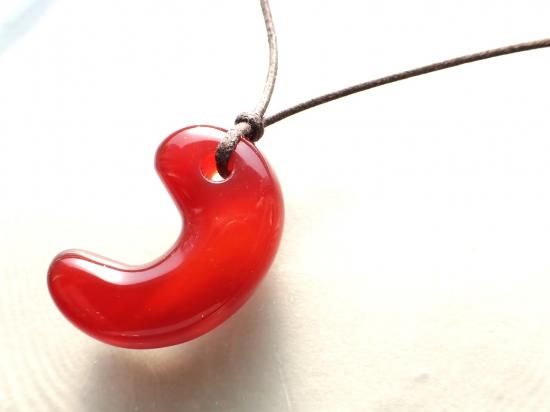 勾玉の38mmは大サイズになります。勾玉のパワー効果を存分に楽しめる大きさなので、当社では本勾玉とよんでいます。天然石加工の専門職人が手作りした製品です。最後の写真は紐を付けた場合のイメージ写真です。レッドアゲート本勾玉は今回紹介した5点で販売終了です。最後の写真2点は紐をつけた場合の見本です。