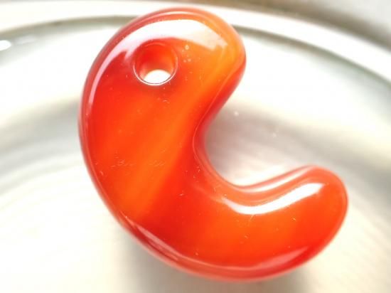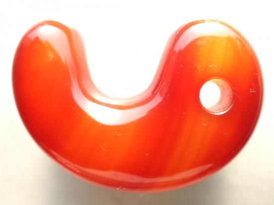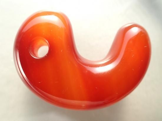 勾玉の38mmは大サイズになります。勾玉のパワー効果を存分に楽しめる大きさなので、当社では本勾玉とよんでいます。天然石加工の専門職人が手作りした製品です。最後の写真は紐を付けた場合のイメージ写真です。レッドアゲート本勾玉は今回紹介した5点で販売終了です。最後の写真2点は紐をつけた場合の見本です。