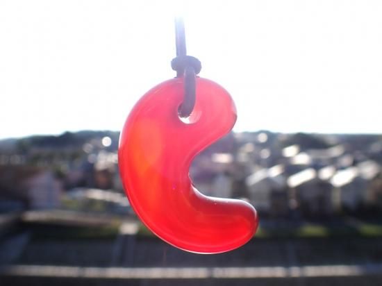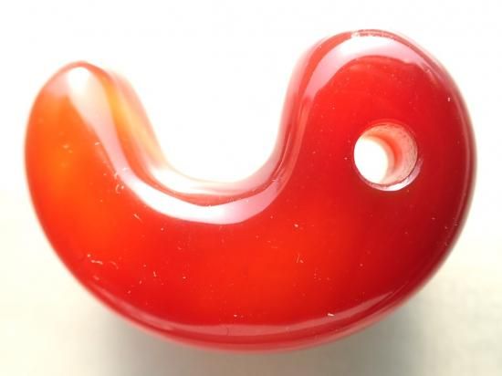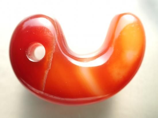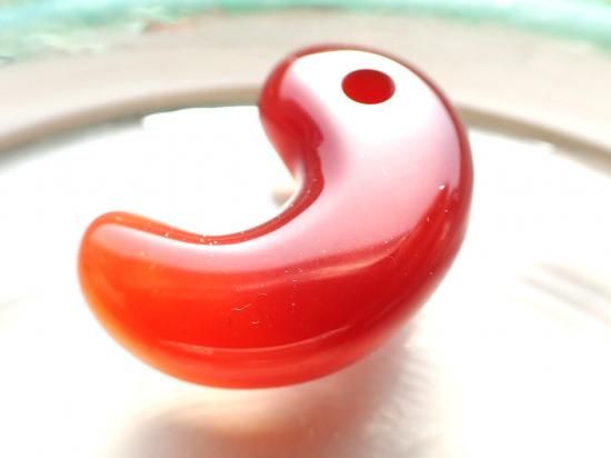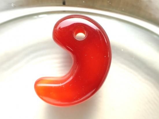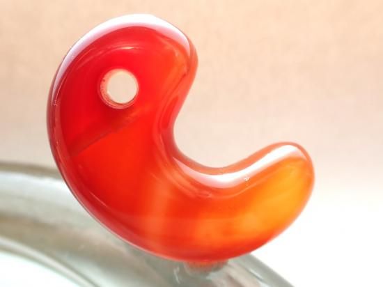 勾玉の38mmは大サイズになります。勾玉のパワー効果を存分に楽しめる大きさなので、当社では本勾玉とよんでいます。天然石加工の専門職人が手作りした製品です。最後の写真は紐を付けた場合のイメージ写真です。レッドアゲート本勾玉は今回紹介した5点で販売終了です。最後の写真2点は紐をつけた場合の見本です。