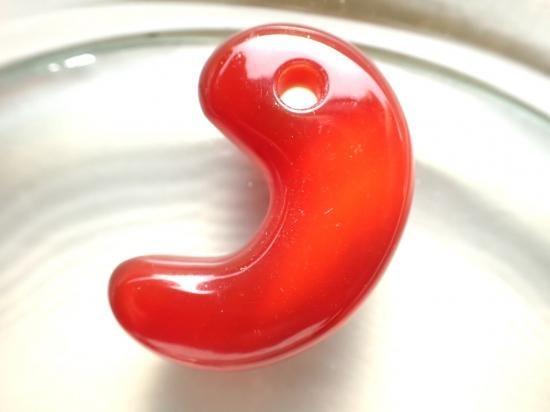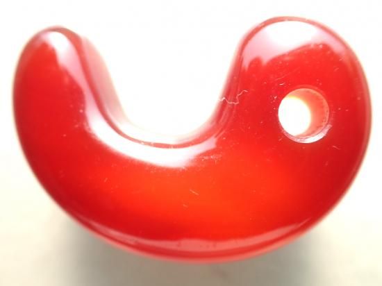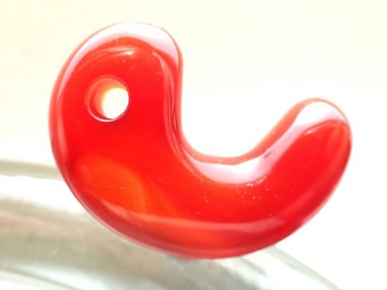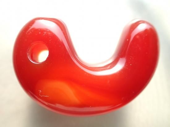勾玉の38mmは大サイズになります。勾玉のパワー効果を存分に楽しめる大きさなので、当社では本勾玉とよんでいます。天然石加工の専門職人が手作りした製品です。最後の写真は紐を付けた場合のイメージ写真です。レッドアゲート本勾玉は今回紹介した5点で販売終了です。最後の写真2点は紐をつけた場合の見本です。