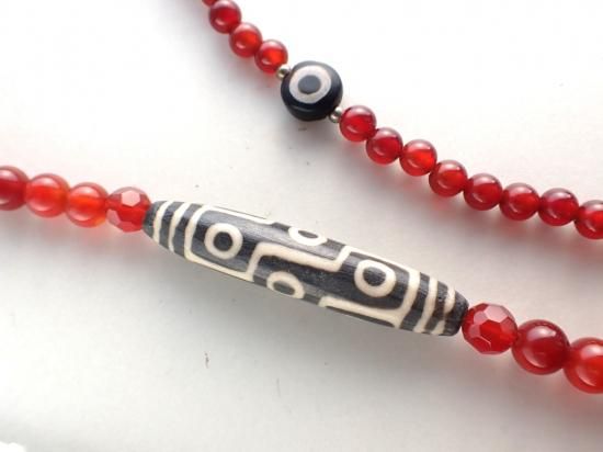 サイズ:全長約70cm、9眼52x11mm、小型天珠は3眼x4、2眼x2、レッドアゲート8−6mm、コインシルバービーズx4、ステンレスワイヤー結び、銀色カニ爪クラスプ。天珠はヒマラヤ地方に伝わる特殊なビーズで、dziと標記して「ジー」と呼びます。