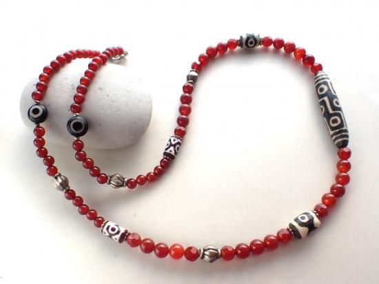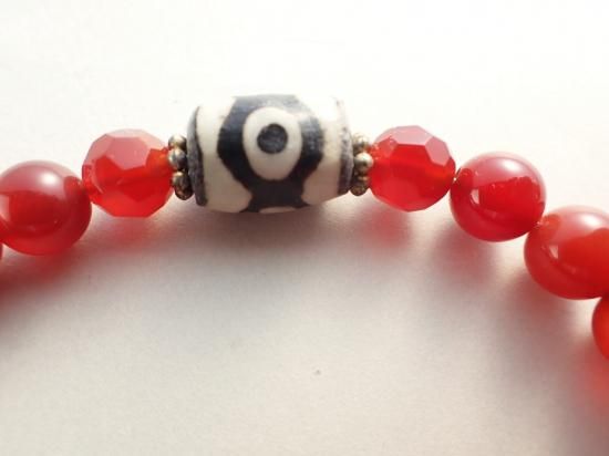 中央の9眼ジービーズ(西蔵天珠)は30年ほど前にチベットで購入した樹脂製品を使用しています。クリアランスセールなので大特価にしてあります。写真の製品をお送りします。
