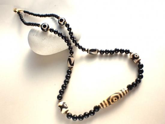 サイズ:全長約60cm、ブラックオニックス・ビーズ約8-4mm、中央の3眼ジービーズ約45x10mm。ステンレスワイヤー結び、銀色クラスプ使用。中央の3眼ジービーズ(西蔵天珠)は30年ほど前にチベットで購入した樹脂製品を使用しています。クリアランスセールなので大特価にしてあります。写真の製品をお送りします。ハートを描いた小石は製品に付属していません。