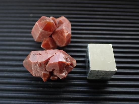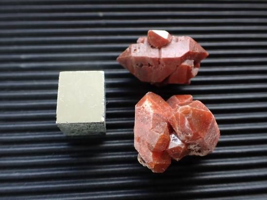 サイズ:約22〜27mm。スペイン、バレンシア産のヘマタイトを内包したダブルポイント・タイプの水晶で。世界中の水晶ファンから珍重され、鉱物少年たちから宝物扱いされてきました。現在の小売り価格は1本が3,000円前後、当社クリアランスセール価格は2本で4,000円を5割引。さらに同じスペイン産のキューブ・パイライト(約12mm、小売値約2,000円)を1個おまけします。キューブ・パイライトは天然の形状で未研磨品です。赤鉄水晶は赤水晶ともよぶようですが、この名称は中国産模造水晶と混同しやすく適切ではありません。赤鉄水晶はハーキマー・ダイアモンドのように泥土状の柔らかな母岩で育ったためにダブルポイントになったと想像しています。