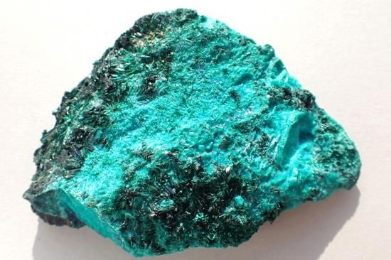 この標本では細くて艶のある針状結晶がおもにクリソコラのうえに付着しています。御飯にフリカケを乗せたのに近い状態なので、保管しておくだけでもはがれてきます。注意して梱包しますが、輸送中に微量こぼれ落ちるものもあるかとおもいます。ご了承ください。