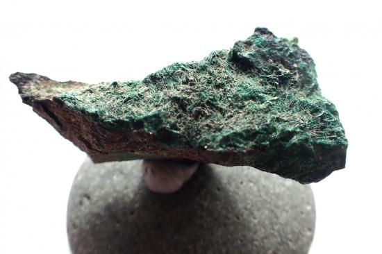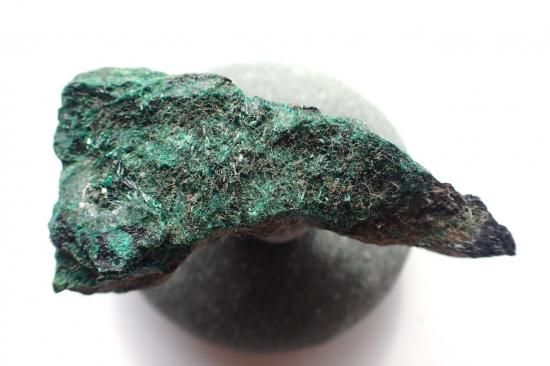 サイズ:約56x29x29mm、38g、約59x30x30mm、52g。写真左側、濃緑色のものがアタカマイト。右側はクリソコラ&マラカイトで、アタカマイトは見当たりません。 アタカマイトの名称は産地の南アメリカ、チリのアタカマ砂漠に由来しています。アズライトやマラカイト同様銅の鉱石の一種で、針状結晶や極微の結晶が岩塊状に凝結した形状で産出します。こうした産状はアクチノライトとネフライトの関係に似ています。丸い石の台は製品に付属していません。