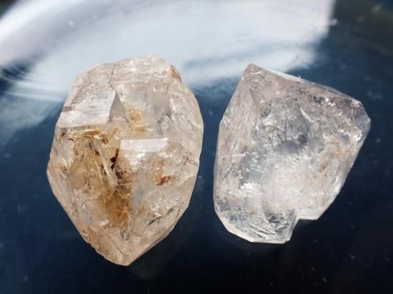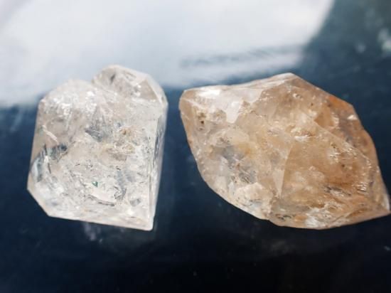 サイズ:約25-31mm(多少ばらつきがあります)。サイズが小さくなると区分けしにくいものもあって、セットにはダブルポイント・タイプも含まれています。2個1組にしてお送りします。ブラジル産。無染色未処理の原石です。エレスチャルの多くは、先にできた水晶原石に付着したり、覆うような形で結晶を成長させます。ひとつの原石上に板状ダブルポイントが多数発達したものは、平行連晶とよばれています。真冬に急激に気温が低下すると、何層にも重なって氷が張る場合があります。同様にケイ酸分の濃い地下の熱水中で、水晶が短時間に結晶すると、成長にゆがみが生じてエレスチャルのような結晶形になるそうです。エレスチャルにはスピリチュアルな領域へ意識をいざなう効力が高い水晶です。