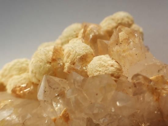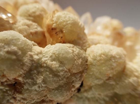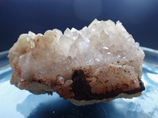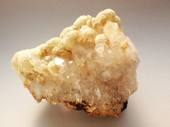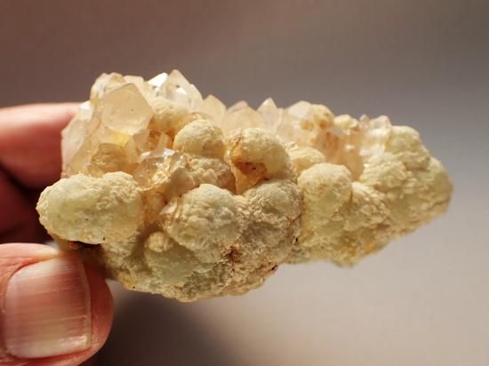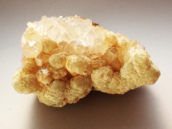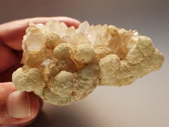 サイズ:約77x68x40mm、216g。中国産。プレナイトと水晶クラスターがよりそっていますプレナイトはアルミニウムを含んだケイ酸塩鉱物で和名は葡萄石。マスカットに似た色合いと球形の結晶から名付けられたようです。てのひらにのるサイズで味わい深い形をしています。プレナイトは若やいだ緑色、半透明のビーズが流通するようになって名前をしられるようになりました。