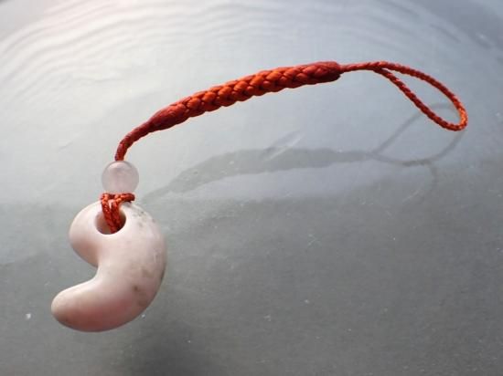 サイズ:約20x15x9mm(多少のばらつきがあります)。日本翡翠と同じ産地、新潟県糸魚川地方産の原石から制作しました。樹脂含浸・着色処理していない天然石製品です。翡翠と似ているので、ピンクヒスイの愛称で親しまれてきました。鉱物名は、ゾイサイトの仲間のチューライトとされてきましたが、クリノゾイサイトの仲間のクリノチューライトという意見もあります。両者は同質異像の関係にあって、目視での鑑別は困難です。最後の写真は紐をつけた場合のサンプルです。根付紐は写真の色とは限りません。
