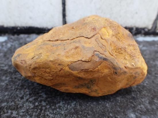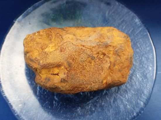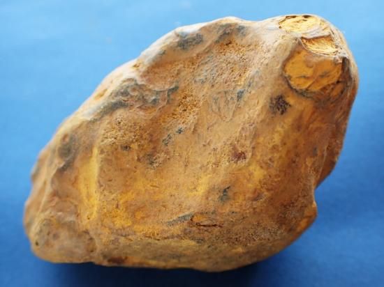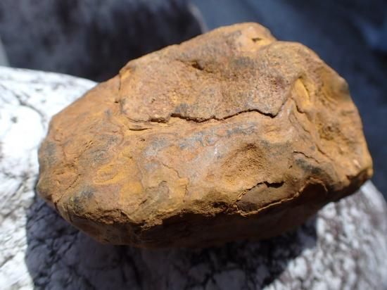 サイズ:約67x48x42、202g。中国産。高師小僧と同じようにしてできるけれど、こちらは粘土を包みこんで発達します。粘土が乾燥したものを振るとカラカラと音がすることから鈴石、鳴る石と呼ばれています。粘土は古代中国の伝説の王、禹(う)にちなんで禹余糧といい、漢方薬として珍重されてきました。北海道などでは天然記念物に指定されているものもあります。奈良の方の遺跡から出土した褐鉄鉱は翡翠勾玉入れとして使われていて話題になりました。鉄と人類の関係を考えるうえで重要な鉱物です。