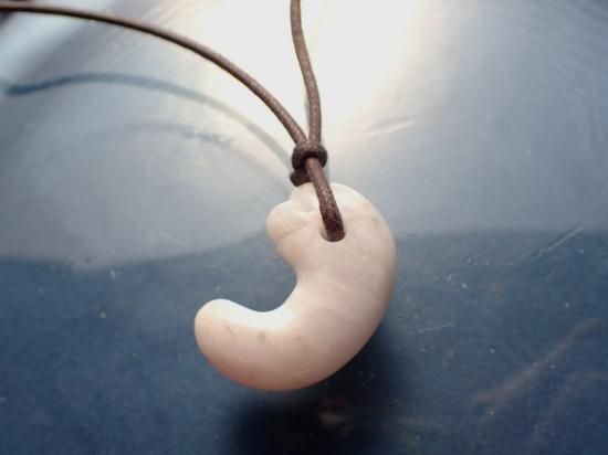 丁字頭勾玉はスパイスの丁字(クローブ)に似ているので名付けられたとされています(あまり似ていません)。一説にはイレズミを表現していて、勾玉のパワーアップをはかった形といわれています。弥生・古墳時代を代表する勾玉の一種で、類似の形のものが列島各地の古墳などから出土します。イルカが笑っているように見える勾玉で、眺めているとおなかのおくほうがくすぐったくなるように感じます。パワーアニマルへの信仰から獣の頭を模したものであろうと想像していますが、詳しいことはわかっていません。