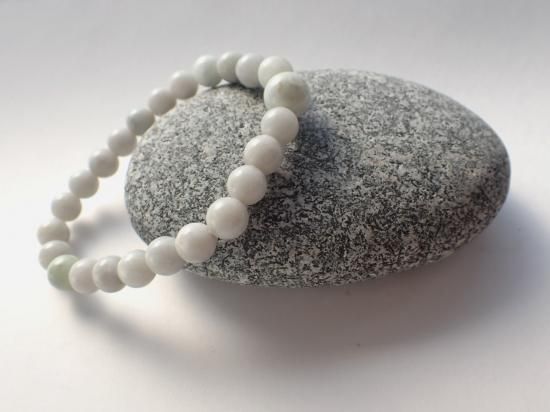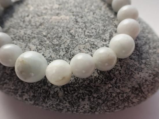 サイズ:8mm玉、10mm玉1個。内径約16cm。白色系。樹脂浸透していない、未染色の新潟県糸魚川市産翡翠原石(糸魚川ヒスイ)を使用しています。オペロンゴム結び。コロナウイルス騒動以前に香港の特約工場で製作したため、安価に提供できています。