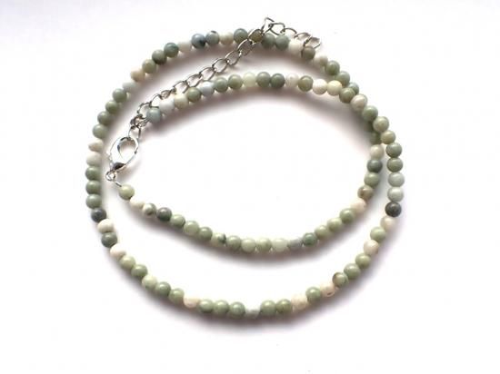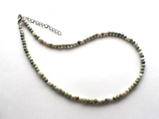 サイズ:日本翡翠約4mm玉、長さ約40cm。。銀色カニ爪クラスプ、5cmアジャスターを使用。ステンレスワイヤー結び。製作工場から緑と白とのツートンカラーで届いたので、選別せずにそのままネックレスにしました。無染色未処理の日本翡翠(糸魚川翡翠)を使用しています。
