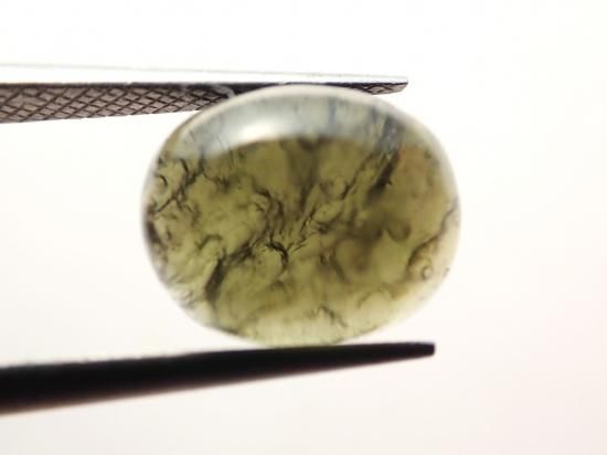 サイズ:約10x8mm、カボーション・カット。チェコ産のモルダバイト・ルースです。チェコの鉱山主から原石を仕入れて、香港の制作会社にカットを特注しました。未処理の天然石製品です。モルダバイト原石特有の表面の皺(しわ)を生かして、底面は原石表面を使用しています。底面の様子がわかるよう透過光で撮影しています。通常の目視では皺の模様はわかりません。一点ものではありません。在庫数12点。お送りするのは1点のみです。。