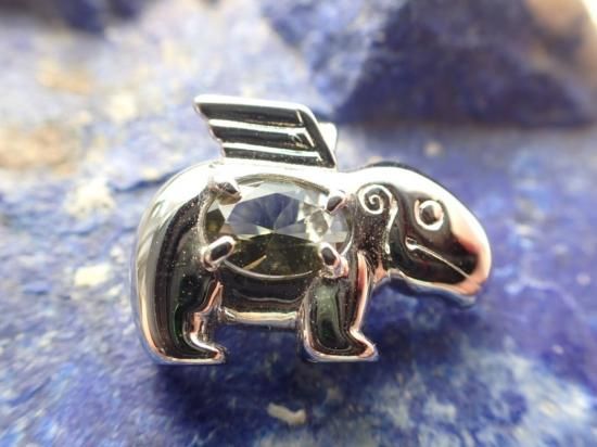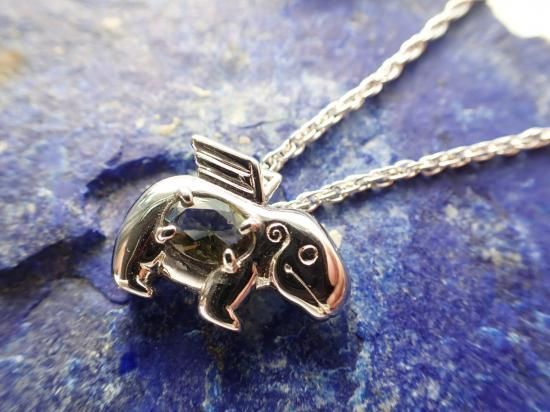サイズ:約19x13mm、胸にモルダバイト5x7mm。当社のオリジナル・キャラクター「ブリンギング・アニマル」のシルバーペンダント、愛称は「ビッキー」といいます。シルバー925のボディに5x7mmのモルダバイトを付けています。スポーツや仕事、恋愛に勝利をもたらすよう願いを込めてビッキーと名付けました。ボディは長期間変色しないようロジウム・プレーティングしてあります。当分の間60cm二重編みの銀色チエーン(真鍮製銀メッキ)をサービスしてお届けします。「ブリンギング・アニマル」は世界各地の神話伝説で語られてきた幸運を運んでくる動物型の精霊です。居着いてくれるよう願うと、幸運を招き寄せられるとされています。在庫数10点。