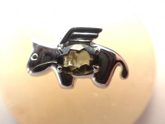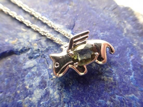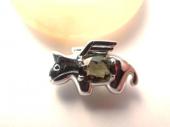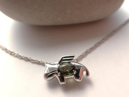 サイズ:約20x12mm、胸にモルダバイト5x7mm。当社のオリジナル・キャラクター「ブリンギング・アニマル」のシルバーペンダント、愛称は「ハッピー」といいます。シルバー925のボディに5x7mmのモルダバイトを付けています。精霊の力に守られていつでも幸せでいられるよう願って「ハッピー」と名付けました。ボディは長期間変色しないようロジウム・プレーティングしてあります。当分の間60cm二重編みの銀色チエーン(真鍮製銀メッキ)をサービスしてお届けします。「ブリンギング・アニマル」は世界各地の神話伝説で語られてきた幸運を運んでくる動物型の精霊です。居着いてくれるよう願うと、幸運を招き寄せられるとされています。在庫数1点。