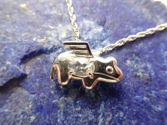 サイズ:約20x12mm、胸にホワイトベリル5x7mm。当社のオリジナル・キャラクター「ブリンギング・アニマル」のシルバーペンダント、愛称は「ラッキー」といいます。シルバー925のボディに5x7mmのホワイトベリルを付けています。精霊の力に守られていつでも幸せでいられるよう願って「ラッキー」と名付けました。ボディは長期間変色しないようロジウム・プレーティングしてあります。当分の間60cm二重編みの銀色チエーン(真鍮製銀メッキ)をサービスしてお届けします。「ブリンギング・アニマル」は世界各地の神話伝説で語られてきた幸運を運んでくる動物型の精霊です。居着いてくれるよう願うと、幸運を招き寄せられるとされています。在庫数2点。