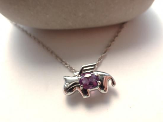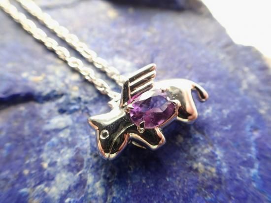 当社のオリジナル・キャラクター「ブリンギング・アニマル」のシルバーペンダント、愛称は「ハッピー」といいます。シルバー925のボディに5x7mmのアメシストを付けています。精霊の力に守られていつでも幸せでいられるよう願って「ハッピー」と名付けました。ボディは長期間変色しないようロジウム・プレーティングしてあります。当分の間60cm二重編みの銀色チエーン(真鍮製銀メッキ)をサービスしてお届けします。