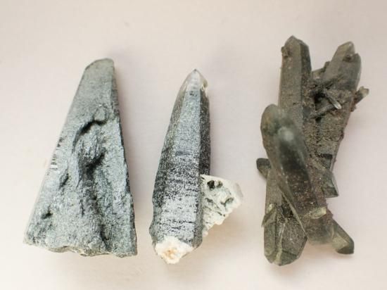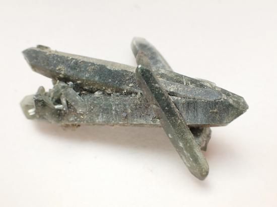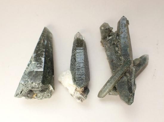 サイズ:約44-53mm、重量35g。ネパールのガネーシュヒマール産クローライト入りニードルクォーツを3個一組にしてお送りします。クローライト(緑泥石)を内包して先端が細い針状の水晶です。ガネーシュヒマールはネパールの首都カトマンズ市の北方にあって、財運の象頭神ガネーシュにちなむ名前。行きも帰りも徒歩だけが頼りの山道を数日かけてのぼり、手掘りしてくると聞いています。聖なる土地にあるモノには聖なる力が宿っているといわれてきました。
