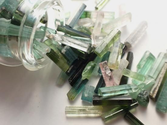 サイズ:瓶の大きさ約48x27mm、サラダトルマリン約28g。おおよそ5-20mm。クリアランスセール価格です。グリーン系のトルマリンを中心にピンクなどが混ざった小粒トルマリンを、ボールに盛った野菜に見立ててサラダ・トルマリンとよんでいます。愛称通りに愛らしいトルマリン・セットです。結晶が柱状で、柱面に条線のあるものをエルバイトとよんでいます。リチウムを含むトルマリンです。ピアスなどアクセサリーの素材として使用できるものもたくさん含まれています。写真の品をお送りします。