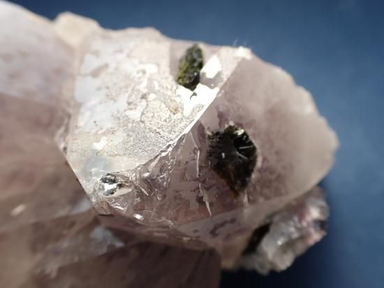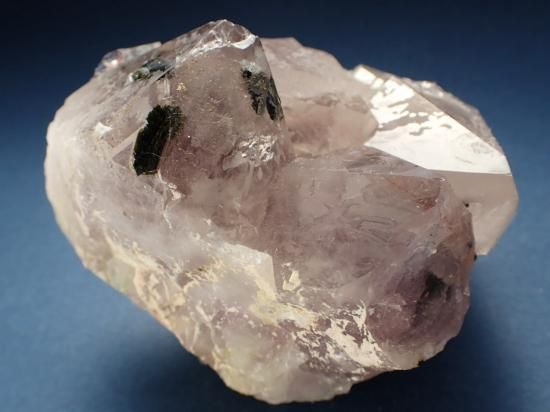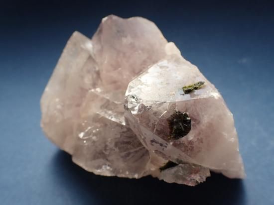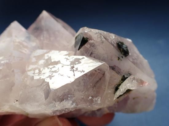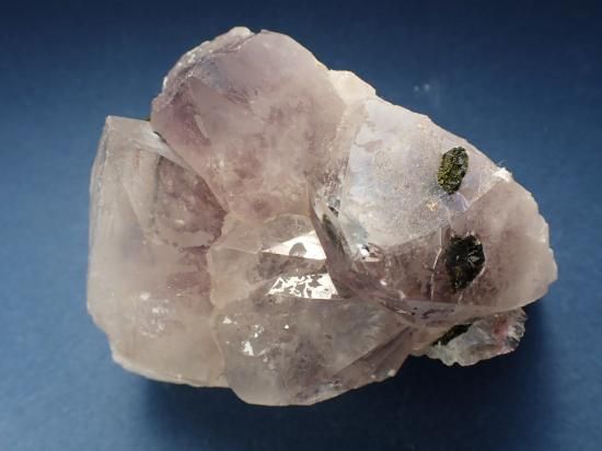 サイズ:約81x62x51mm、240g。ユニークな形状で知られる四川省美姑(スーチョワン・メイグー)産の水晶クラスターです。エピドートが随伴しています。内包されている鉱物のせいでライトアメシストのようにみえます。
