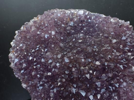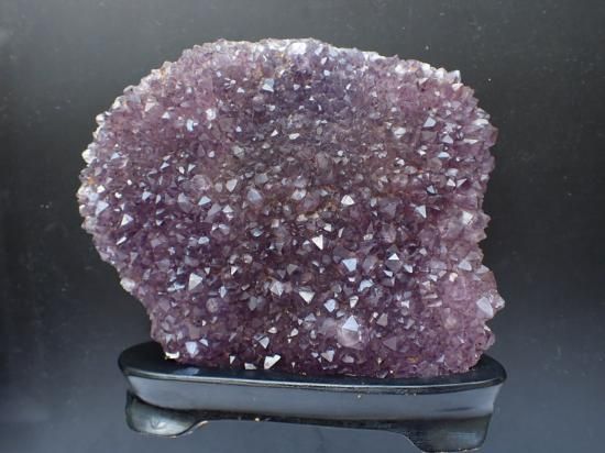サイズ:約135x115x30mm、640g。台付。ゴージャスな色合いの小粒の結晶が集ったブラジル産アメシスト・クラスターです。日光をあびつづけると退色しやすいので、なるべく薄暗い場所に保管してください。