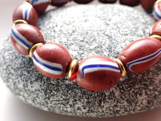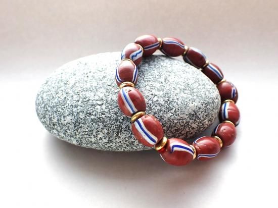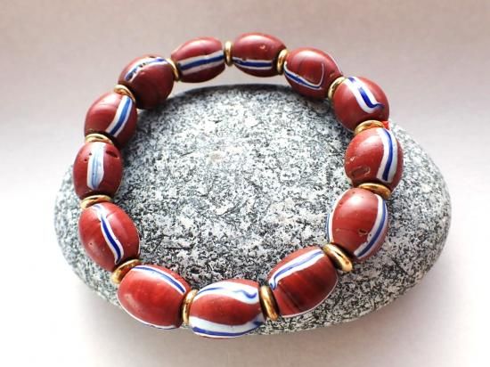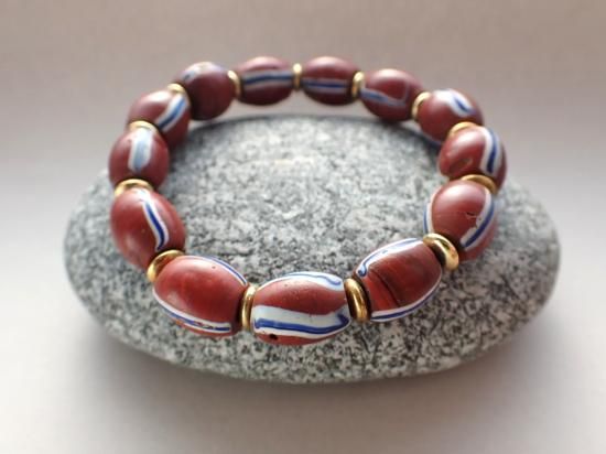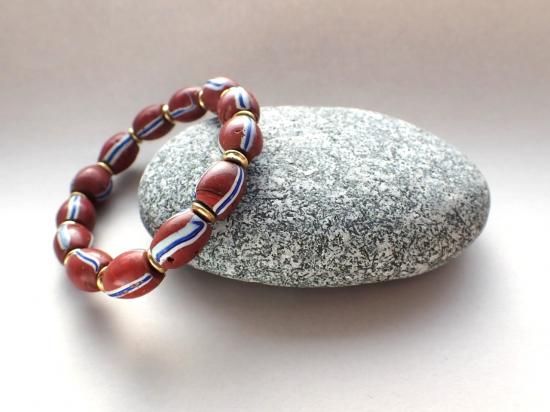 サイズ:トンボ玉約12x10mm。金色メタルビーズ6mm、ブレスレットの内径16cm、オペロンゴム結び。 18世紀から19世紀にかけて、ヴェネチア(ベニス)のムラーノ島で作られたガラスビーズで、おもにアフリカ諸国に運ばれ、金、象牙、奴隷との交易に用いられました。そのためトレードビーズとよばれています。花柄(ミルフィオレ)や目玉模様(アイビーズ)、モザイク模様など、色鮮やかな意匠に特徴があります。現代になってアフリカから欧米に運び戻されて世界的な流行になりました。コレクターズアイテムとして人気が高く、日本にも専門の博物館があり、豪華な書籍が発行されています。