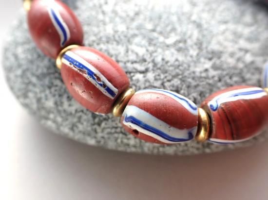 樽に詰めて船でアフリカに運ばれたビーズなので、小さなカケがあったり割れていたりしています。アンティークならではのこととご理解ください。ブレスレットに組んでありますが、解体してアクセサリー製作のパーツとして利用できます。
