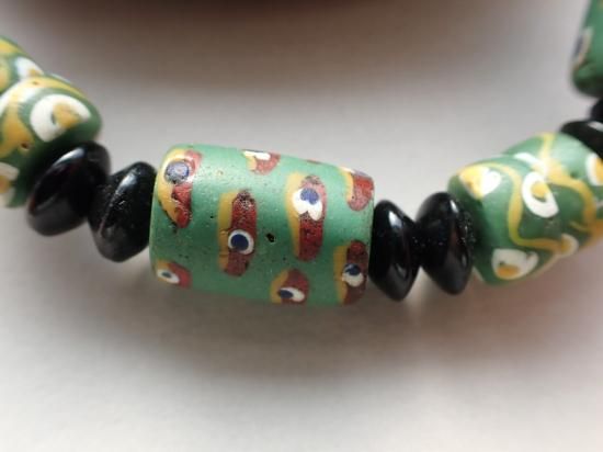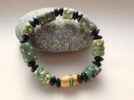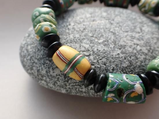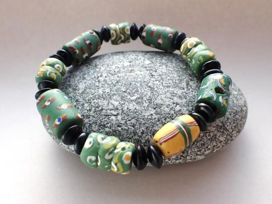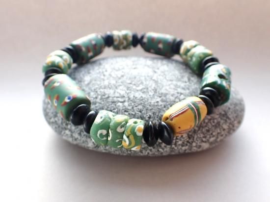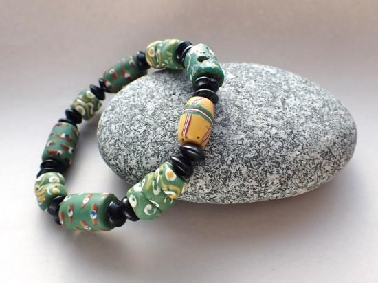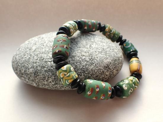 サイズ:トンボ玉約5-18x10mm。黒ロンデル・ガラスビーズ8mm、ブレスレットの内径17cm、オペロンゴム結び。18世紀から19世紀にかけて、ヴェネチア(ベニス)のムラーノ島で作られたガラスビーズで、おもにアフリカ諸国に運ばれ、金、象牙、奴隷との交易に用いられました。そのためトレードビーズとよばれています。花柄(ミルフィオレ)や目玉模様(アイビーズ)、モザイク模様など、色鮮やかな意匠に特徴があります。現代になってアフリカから欧米に運び戻されて世界的な流行になりました。コレクターズアイテムとして人気が高く、日本にも専門の博物館があり、豪華な書籍が発行されています。
