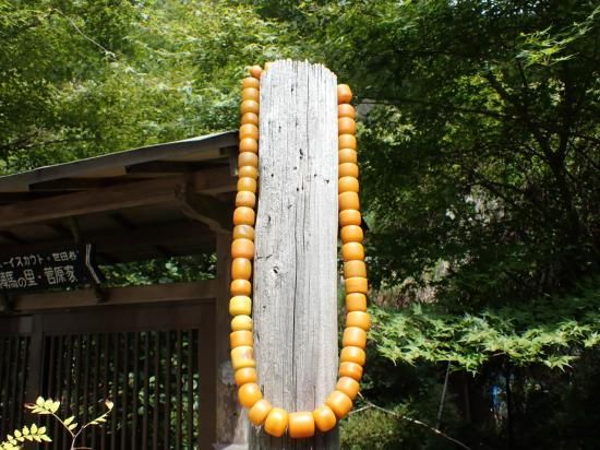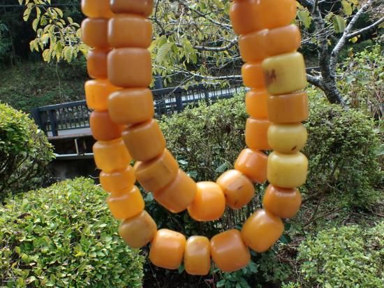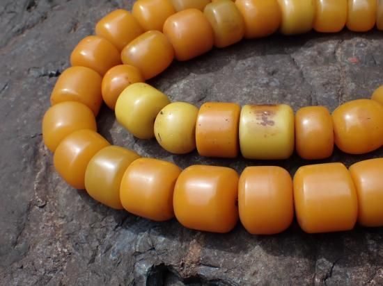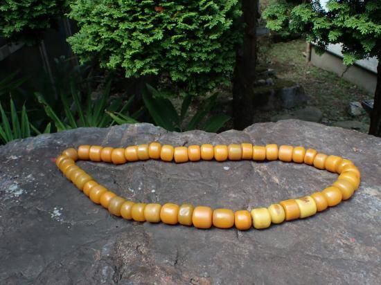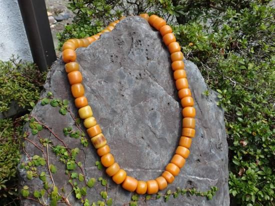 1個の直径が3cmほど、50個を紐に通して1連にしたビンテージもののチベッタンアンバーの特大ビーズです。30数年前ネパールの首都カトマンズのアンティークショップで仕入れてきました。天然の琥珀の再生品と思います。ネパールに行っても、こんなふうに数をまとめて入手できる機会はあまりありません。